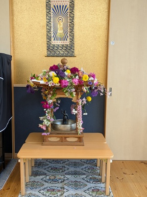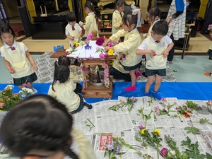 年長組さんがお友達が持ってきてくれたお花で花御堂を素敵に飾ってくれました。